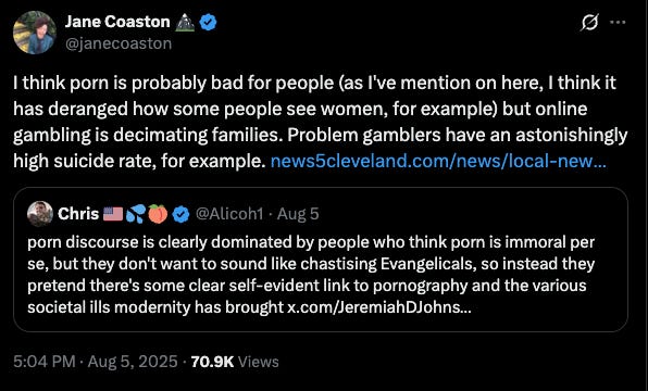 It’s really wild to me how much of a chokehold porn has on the collective consciousness, especially in the realm of blaming it on young male malaise, when gambling is a bigger problem for young men across every measurable dimension by miles.